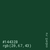 Цвет #14432B в цветовой модели RGB обозначается тремя октетами (20, 67, 43) в десятичном формате и #14432B в шестнадцатиричном (hex) формате, которые являются интенсивностью красного 20 (hex 14), интенсивность зелёного 67 (hex 43) и интенсивность синего 43 (hex 2B).