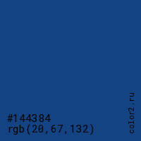 Цвет #144384 в цветовой модели RGB обозначается тремя октетами (20, 67, 132) в десятичном формате и #144384 в шестнадцатиричном (hex) формате, которые являются интенсивностью красного 20 (hex 14), интенсивность зелёного 67 (hex 43) и интенсивность синего 132 (hex 84).