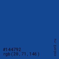 Цвет #144792 в цветовой модели RGB обозначается тремя октетами (20, 71, 146) в десятичном формате и #144792 в шестнадцатиричном (hex) формате, которые являются интенсивностью красного 20 (hex 14), интенсивность зелёного 71 (hex 47) и интенсивность синего 146 (hex 92).