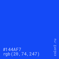Цвет #144AF7 в цветовой модели RGB обозначается тремя октетами (20, 74, 247) в десятичном формате и #144AF7 в шестнадцатиричном (hex) формате, которые являются интенсивностью красного 20 (hex 14), интенсивность зелёного 74 (hex 4A) и интенсивность синего 247 (hex F7).