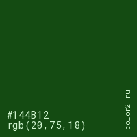 Цвет #144B12 в цветовой модели RGB обозначается тремя октетами (20, 75, 18) в десятичном формате и #144B12 в шестнадцатиричном (hex) формате, которые являются интенсивностью красного 20 (hex 14), интенсивность зелёного 75 (hex 4B) и интенсивность синего 18 (hex 12).