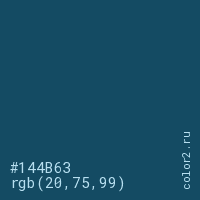 Цвет #144B63 в цветовой модели RGB обозначается тремя октетами (20, 75, 99) в десятичном формате и #144B63 в шестнадцатиричном (hex) формате, которые являются интенсивностью красного 20 (hex 14), интенсивность зелёного 75 (hex 4B) и интенсивность синего 99 (hex 63).