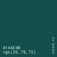 Цвет #144E4B в цветовой модели RGB обозначается тремя октетами (20, 78, 75) в десятичном формате и #144E4B в шестнадцатиричном (hex) формате, которые являются интенсивностью красного 20 (hex 14), интенсивность зелёного 78 (hex 4E) и интенсивность синего 75 (hex 4B).