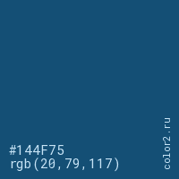 Цвет #144F75 в цветовой модели RGB обозначается тремя октетами (20, 79, 117) в десятичном формате и #144F75 в шестнадцатиричном (hex) формате, которые являются интенсивностью красного 20 (hex 14), интенсивность зелёного 79 (hex 4F) и интенсивность синего 117 (hex 75).