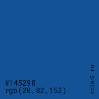 Цвет #145298 в цветовой модели RGB обозначается тремя октетами (20, 82, 152) в десятичном формате и #145298 в шестнадцатиричном (hex) формате, которые являются интенсивностью красного 20 (hex 14), интенсивность зелёного 82 (hex 52) и интенсивность синего 152 (hex 98).