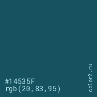 Цвет #14535F в цветовой модели RGB обозначается тремя октетами (20, 83, 95) в десятичном формате и #14535F в шестнадцатиричном (hex) формате, которые являются интенсивностью красного 20 (hex 14), интенсивность зелёного 83 (hex 53) и интенсивность синего 95 (hex 5F).