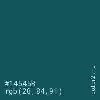 Цвет #14545B в цветовой модели RGB обозначается тремя октетами (20, 84, 91) в десятичном формате и #14545B в шестнадцатиричном (hex) формате, которые являются интенсивностью красного 20 (hex 14), интенсивность зелёного 84 (hex 54) и интенсивность синего 91 (hex 5B).