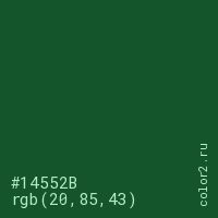 Цвет #14552B в цветовой модели RGB обозначается тремя октетами (20, 85, 43) в десятичном формате и #14552B в шестнадцатиричном (hex) формате, которые являются интенсивностью красного 20 (hex 14), интенсивность зелёного 85 (hex 55) и интенсивность синего 43 (hex 2B).