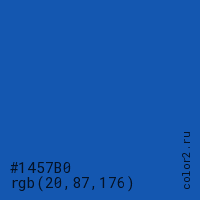 Цвет #1457B0 в цветовой модели RGB обозначается тремя октетами (20, 87, 176) в десятичном формате и #1457B0 в шестнадцатиричном (hex) формате, которые являются интенсивностью красного 20 (hex 14), интенсивность зелёного 87 (hex 57) и интенсивность синего 176 (hex B0).