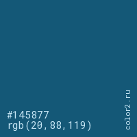 Цвет #145877 в цветовой модели RGB обозначается тремя октетами (20, 88, 119) в десятичном формате и #145877 в шестнадцатиричном (hex) формате, которые являются интенсивностью красного 20 (hex 14), интенсивность зелёного 88 (hex 58) и интенсивность синего 119 (hex 77).