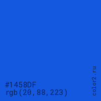 Цвет #1458DF в цветовой модели RGB обозначается тремя октетами (20, 88, 223) в десятичном формате и #1458DF в шестнадцатиричном (hex) формате, которые являются интенсивностью красного 20 (hex 14), интенсивность зелёного 88 (hex 58) и интенсивность синего 223 (hex DF).