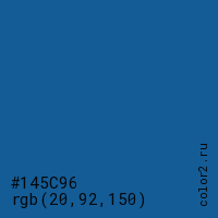 Цвет #145C96 в цветовой модели RGB обозначается тремя октетами (20, 92, 150) в десятичном формате и #145C96 в шестнадцатиричном (hex) формате, которые являются интенсивностью красного 20 (hex 14), интенсивность зелёного 92 (hex 5C) и интенсивность синего 150 (hex 96).