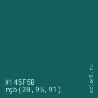 Цвет #145F5B в цветовой модели RGB обозначается тремя октетами (20, 95, 91) в десятичном формате и #145F5B в шестнадцатиричном (hex) формате, которые являются интенсивностью красного 20 (hex 14), интенсивность зелёного 95 (hex 5F) и интенсивность синего 91 (hex 5B).