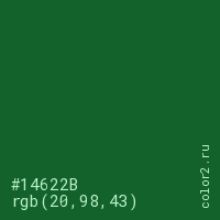 Цвет #14622B в цветовой модели RGB обозначается тремя октетами (20, 98, 43) в десятичном формате и #14622B в шестнадцатиричном (hex) формате, которые являются интенсивностью красного 20 (hex 14), интенсивность зелёного 98 (hex 62) и интенсивность синего 43 (hex 2B).