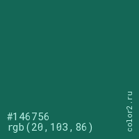 Цвет #146756 в цветовой модели RGB обозначается тремя октетами (20, 103, 86) в десятичном формате и #146756 в шестнадцатиричном (hex) формате, которые являются интенсивностью красного 20 (hex 14), интенсивность зелёного 103 (hex 67) и интенсивность синего 86 (hex 56).