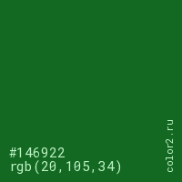 Цвет #146922 в цветовой модели RGB обозначается тремя октетами (20, 105, 34) в десятичном формате и #146922 в шестнадцатиричном (hex) формате, которые являются интенсивностью красного 20 (hex 14), интенсивность зелёного 105 (hex 69) и интенсивность синего 34 (hex 22).