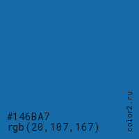 Цвет #146BA7 в цветовой модели RGB обозначается тремя октетами (20, 107, 167) в десятичном формате и #146BA7 в шестнадцатиричном (hex) формате, которые являются интенсивностью красного 20 (hex 14), интенсивность зелёного 107 (hex 6B) и интенсивность синего 167 (hex A7).