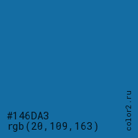 Цвет #146DA3 в цветовой модели RGB обозначается тремя октетами (20, 109, 163) в десятичном формате и #146DA3 в шестнадцатиричном (hex) формате, которые являются интенсивностью красного 20 (hex 14), интенсивность зелёного 109 (hex 6D) и интенсивность синего 163 (hex A3).
