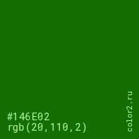 Цвет #146E02 в цветовой модели RGB обозначается тремя октетами (20, 110, 2) в десятичном формате и #146E02 в шестнадцатиричном (hex) формате, которые являются интенсивностью красного 20 (hex 14), интенсивность зелёного 110 (hex 6E) и интенсивность синего 2 (hex 02).