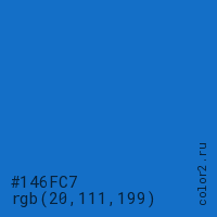 Цвет #146FC7 в цветовой модели RGB обозначается тремя октетами (20, 111, 199) в десятичном формате и #146FC7 в шестнадцатиричном (hex) формате, которые являются интенсивностью красного 20 (hex 14), интенсивность зелёного 111 (hex 6F) и интенсивность синего 199 (hex C7).