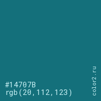 Цвет #14707B в цветовой модели RGB обозначается тремя октетами (20, 112, 123) в десятичном формате и #14707B в шестнадцатиричном (hex) формате, которые являются интенсивностью красного 20 (hex 14), интенсивность зелёного 112 (hex 70) и интенсивность синего 123 (hex 7B).