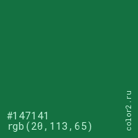 Цвет #147141 в цветовой модели RGB обозначается тремя октетами (20, 113, 65) в десятичном формате и #147141 в шестнадцатиричном (hex) формате, которые являются интенсивностью красного 20 (hex 14), интенсивность зелёного 113 (hex 71) и интенсивность синего 65 (hex 41).