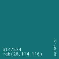 Цвет #147274 в цветовой модели RGB обозначается тремя октетами (20, 114, 116) в десятичном формате и #147274 в шестнадцатиричном (hex) формате, которые являются интенсивностью красного 20 (hex 14), интенсивность зелёного 114 (hex 72) и интенсивность синего 116 (hex 74).
