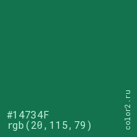 Цвет #14734F в цветовой модели RGB обозначается тремя октетами (20, 115, 79) в десятичном формате и #14734F в шестнадцатиричном (hex) формате, которые являются интенсивностью красного 20 (hex 14), интенсивность зелёного 115 (hex 73) и интенсивность синего 79 (hex 4F).