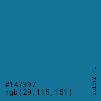 Цвет #147397 в цветовой модели RGB обозначается тремя октетами (20, 115, 151) в десятичном формате и #147397 в шестнадцатиричном (hex) формате, которые являются интенсивностью красного 20 (hex 14), интенсивность зелёного 115 (hex 73) и интенсивность синего 151 (hex 97).