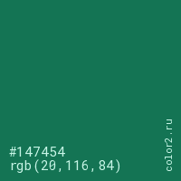 Цвет #147454 в цветовой модели RGB обозначается тремя октетами (20, 116, 84) в десятичном формате и #147454 в шестнадцатиричном (hex) формате, которые являются интенсивностью красного 20 (hex 14), интенсивность зелёного 116 (hex 74) и интенсивность синего 84 (hex 54).