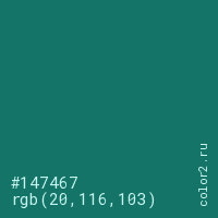 Цвет #147467 в цветовой модели RGB обозначается тремя октетами (20, 116, 103) в десятичном формате и #147467 в шестнадцатиричном (hex) формате, которые являются интенсивностью красного 20 (hex 14), интенсивность зелёного 116 (hex 74) и интенсивность синего 103 (hex 67).