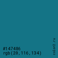 Цвет #147486 в цветовой модели RGB обозначается тремя октетами (20, 116, 134) в десятичном формате и #147486 в шестнадцатиричном (hex) формате, которые являются интенсивностью красного 20 (hex 14), интенсивность зелёного 116 (hex 74) и интенсивность синего 134 (hex 86).