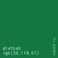 Цвет #147643 в цветовой модели RGB обозначается тремя октетами (20, 118, 67) в десятичном формате и #147643 в шестнадцатиричном (hex) формате, которые являются интенсивностью красного 20 (hex 14), интенсивность зелёного 118 (hex 76) и интенсивность синего 67 (hex 43).