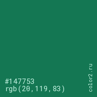 Цвет #147753 в цветовой модели RGB обозначается тремя октетами (20, 119, 83) в десятичном формате и #147753 в шестнадцатиричном (hex) формате, которые являются интенсивностью красного 20 (hex 14), интенсивность зелёного 119 (hex 77) и интенсивность синего 83 (hex 53).
