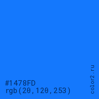 Цвет #1478FD в цветовой модели RGB обозначается тремя октетами (20, 120, 253) в десятичном формате и #1478FD в шестнадцатиричном (hex) формате, которые являются интенсивностью красного 20 (hex 14), интенсивность зелёного 120 (hex 78) и интенсивность синего 253 (hex FD).