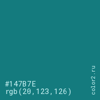 Цвет #147B7E в цветовой модели RGB обозначается тремя октетами (20, 123, 126) в десятичном формате и #147B7E в шестнадцатиричном (hex) формате, которые являются интенсивностью красного 20 (hex 14), интенсивность зелёного 123 (hex 7B) и интенсивность синего 126 (hex 7E).