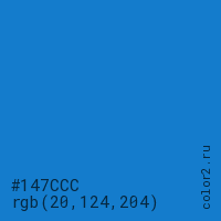 Цвет #147CCC в цветовой модели RGB обозначается тремя октетами (20, 124, 204) в десятичном формате и #147CCC в шестнадцатиричном (hex) формате, которые являются интенсивностью красного 20 (hex 14), интенсивность зелёного 124 (hex 7C) и интенсивность синего 204 (hex CC).