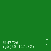 Цвет #147F20 в цветовой модели RGB обозначается тремя октетами (20, 127, 32) в десятичном формате и #147F20 в шестнадцатиричном (hex) формате, которые являются интенсивностью красного 20 (hex 14), интенсивность зелёного 127 (hex 7F) и интенсивность синего 32 (hex 20).