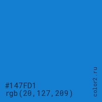 Цвет #147FD1 в цветовой модели RGB обозначается тремя октетами (20, 127, 209) в десятичном формате и #147FD1 в шестнадцатиричном (hex) формате, которые являются интенсивностью красного 20 (hex 14), интенсивность зелёного 127 (hex 7F) и интенсивность синего 209 (hex D1).