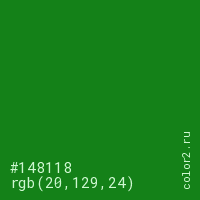 Цвет #148118 в цветовой модели RGB обозначается тремя октетами (20, 129, 24) в десятичном формате и #148118 в шестнадцатиричном (hex) формате, которые являются интенсивностью красного 20 (hex 14), интенсивность зелёного 129 (hex 81) и интенсивность синего 24 (hex 18).