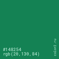 Цвет #148254 в цветовой модели RGB обозначается тремя октетами (20, 130, 84) в десятичном формате и #148254 в шестнадцатиричном (hex) формате, которые являются интенсивностью красного 20 (hex 14), интенсивность зелёного 130 (hex 82) и интенсивность синего 84 (hex 54).