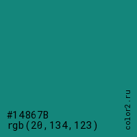 Цвет #14867B в цветовой модели RGB обозначается тремя октетами (20, 134, 123) в десятичном формате и #14867B в шестнадцатиричном (hex) формате, которые являются интенсивностью красного 20 (hex 14), интенсивность зелёного 134 (hex 86) и интенсивность синего 123 (hex 7B).