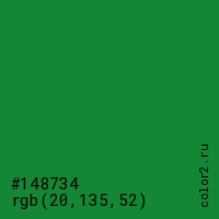 Цвет #148734 в цветовой модели RGB обозначается тремя октетами (20, 135, 52) в десятичном формате и #148734 в шестнадцатиричном (hex) формате, которые являются интенсивностью красного 20 (hex 14), интенсивность зелёного 135 (hex 87) и интенсивность синего 52 (hex 34).