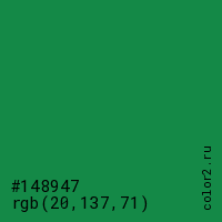 Цвет #148947 в цветовой модели RGB обозначается тремя октетами (20, 137, 71) в десятичном формате и #148947 в шестнадцатиричном (hex) формате, которые являются интенсивностью красного 20 (hex 14), интенсивность зелёного 137 (hex 89) и интенсивность синего 71 (hex 47).