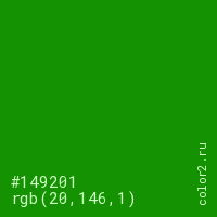 Цвет #149201 в цветовой модели RGB обозначается тремя октетами (20, 146, 1) в десятичном формате и #149201 в шестнадцатиричном (hex) формате, которые являются интенсивностью красного 20 (hex 14), интенсивность зелёного 146 (hex 92) и интенсивность синего 1 (hex 01).
