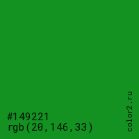Цвет #149221 в цветовой модели RGB обозначается тремя октетами (20, 146, 33) в десятичном формате и #149221 в шестнадцатиричном (hex) формате, которые являются интенсивностью красного 20 (hex 14), интенсивность зелёного 146 (hex 92) и интенсивность синего 33 (hex 21).