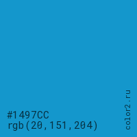 Цвет #1497CC в цветовой модели RGB обозначается тремя октетами (20, 151, 204) в десятичном формате и #1497CC в шестнадцатиричном (hex) формате, которые являются интенсивностью красного 20 (hex 14), интенсивность зелёного 151 (hex 97) и интенсивность синего 204 (hex CC).