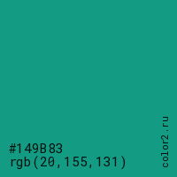 Цвет #149B83 в цветовой модели RGB обозначается тремя октетами (20, 155, 131) в десятичном формате и #149B83 в шестнадцатиричном (hex) формате, которые являются интенсивностью красного 20 (hex 14), интенсивность зелёного 155 (hex 9B) и интенсивность синего 131 (hex 83).