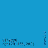 Цвет #149CD0 в цветовой модели RGB обозначается тремя октетами (20, 156, 208) в десятичном формате и #149CD0 в шестнадцатиричном (hex) формате, которые являются интенсивностью красного 20 (hex 14), интенсивность зелёного 156 (hex 9C) и интенсивность синего 208 (hex D0).