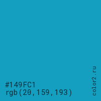 Цвет #149FC1 в цветовой модели RGB обозначается тремя октетами (20, 159, 193) в десятичном формате и #149FC1 в шестнадцатиричном (hex) формате, которые являются интенсивностью красного 20 (hex 14), интенсивность зелёного 159 (hex 9F) и интенсивность синего 193 (hex C1).